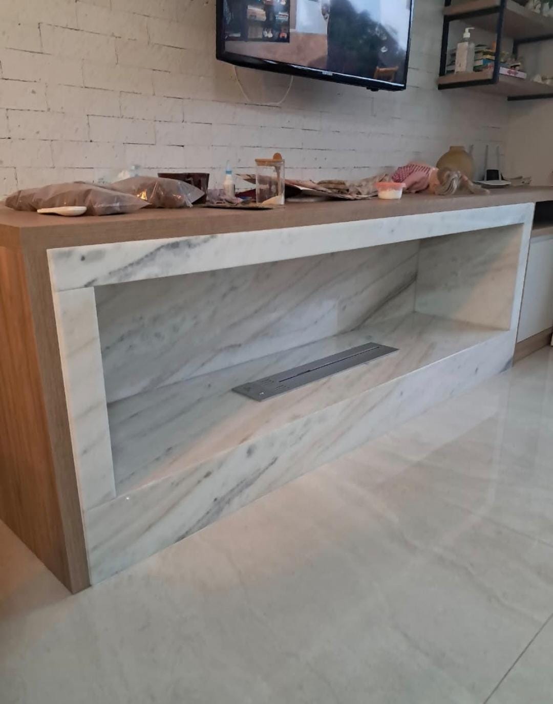 Lareira em Mármore Carrarinha Carrara Gioia Parede Onix Miele Bronze Armani Bege Bahia Granito Via Láctea Preto São Gabriel Cygnus Top Travertino Navona Bancada com Marrom Absoluto Gris Mônaco Armani Carrara Gioia Daino Realle Imperador Nacional Romano Montcharmot e Absoluto